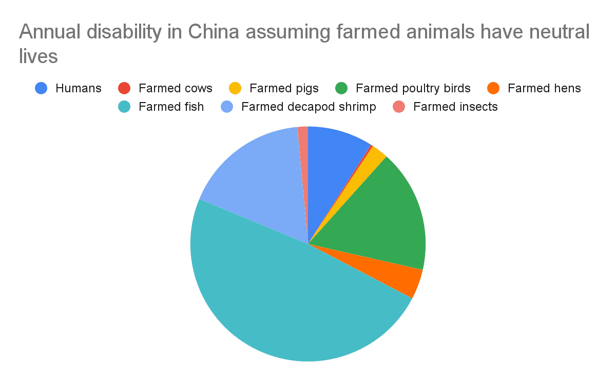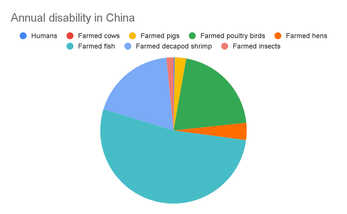 In this post, I estimate the annual disability of and philanthropic spending on humans and farmed animals, both globally and in China[1]. The data and calculations are in this Sheet.