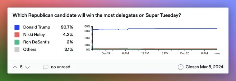 In the future, we plan to use multiple choice questions for these kinds of questions. Multiple choice questions ensure logically coherent predictions that sum to 100%, so forecasts will be more accurate.