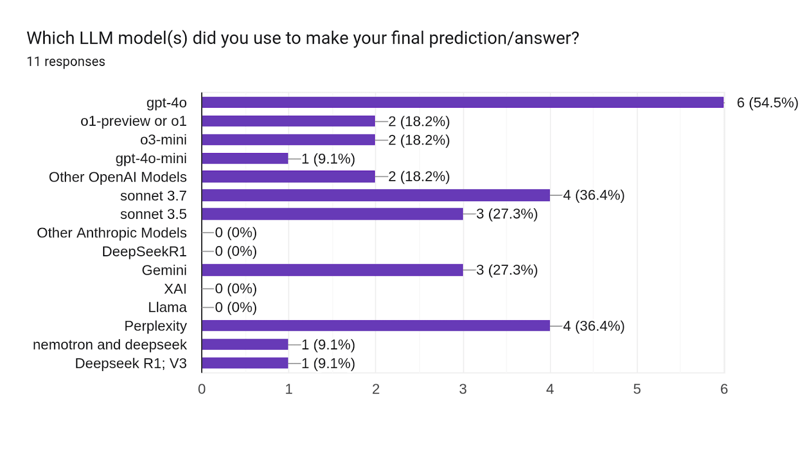 To compare the capabilities of different LLM models, Metaculus ran 11 bots, all with the same prompt. This prompt is very similar to the one that was used in Q3 and Q4, though updated to support numeric and multiple-choice questions. See the section on code/data for links to the template bot prompts.