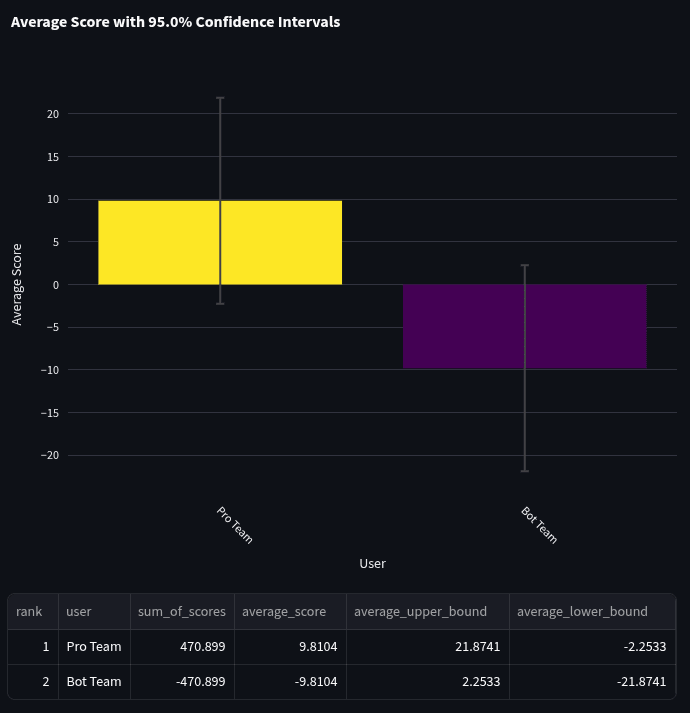 The negative score indicates that the bot team had lower accuracy than the Pro team. A two-sided t-test confirmed that pros perform significantly differently from bots (p = 0.0014), while a one-sided t-test demonstrated that pros significantly outperform bots (p = 0.0007).