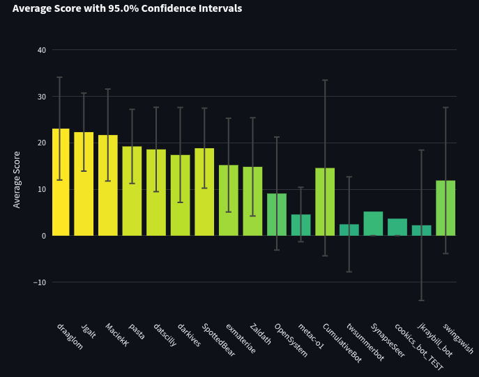 Let's first take a look at the bot-only tournament. This tournament pits all the bots against each other and does not include any humans. You can see the full leaderboard here. Since there are 45 bots, let's first focus on the bots that topped the leaderboard. Below are the top 5 bots when ranked by the sum of their spot peer scores.