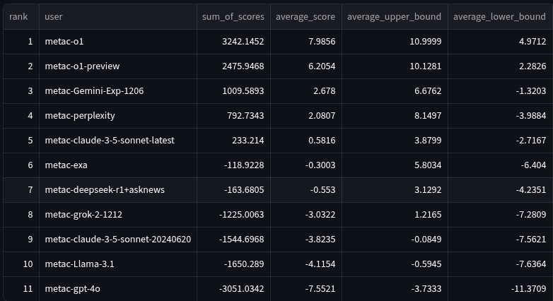 - Finally, the Community Prediction is, on average, the most trustworthy signal of the future that we have. As described in the next paragraph, the community forecasted metac-o1’s rank to be much worse than it actually was, so this may be additional evidence that metac-o1 got lucky this quarter.