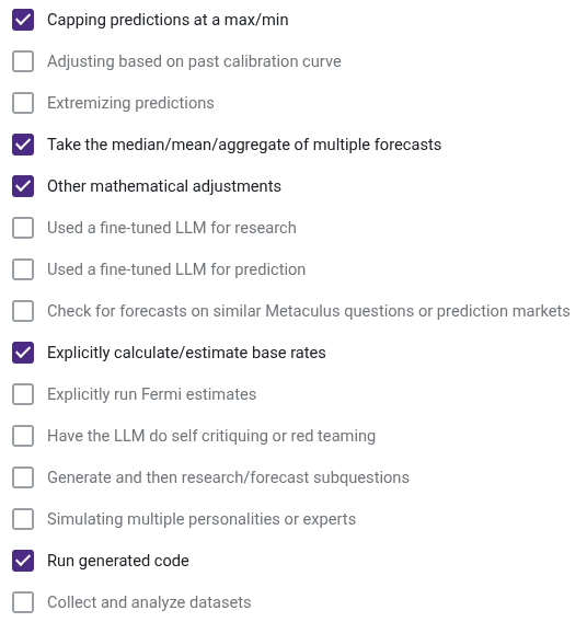 Bot D: I think information retrieval is extremely important; look at some examples of the information your bot is using to make a prediction and check for 1.) accuracy, and 2.) completeness. Reasoning models are always getting better out of the box, meaning information retrieval will be the key magic as opposed to special prompting. With that said, it's also crucial to think about model failure and correcting for poor reasoning/question interpretation. At a minimum, multiple predictions can help solve edge-case incorrect assumptions about a question that result in overconfident predictions.
