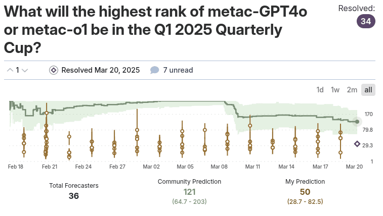 While the cup was ongoing, participants tried to forecast the best-ranking bot between metac-o1 and metac-gpt-4o. You can see the question here. The orange bars are metac-o1’s forecasts. Metac-o1 forecast 5 times before submitting an aggregate forecast of its attempts (which is why there are multiple ‘center dots’ every 2 days). Reviewing the question, we find that metac-o1 forecasted its own performance much better than the community, which brought it from 34th place (the resolution value) to 25th after this question was scored. But generally, this is just an interesting anecdote (and there are other questions where it forecasted much worse).