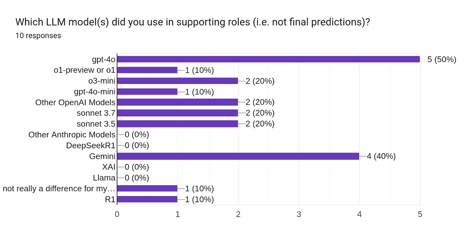 Bot makers were asked, “When building, have you optimized more for research (external information retrieval) or reasoning (processing information given to the LLM)?”. Of the prize winners, 30% leaned toward research, while only 10% leaned toward reasoning. 40% focused “about the same for both”.
