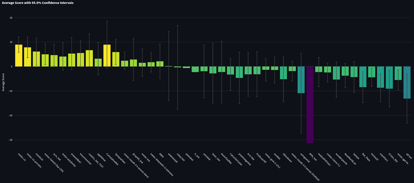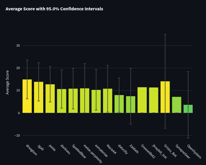 Twsummerbot (ranked 8th) used gpt-4o in both their final forecast and in supporting roles. They crushed the equivalent template bot (metac-gpt-4o), which ranked 44th. In the bot-only tournament, Twsummerbot got an average spot peer score of 5.51 [95% CI: 10.61, 0.42] while metac-gpt-4o got -5.53 [95% CI: -1.46, -9.60]. The error bars of twsummerbot’s score do not cross over at all with metac-gpt-4o’s score, indicating twsummerbot had a significantly better spot peer score.
