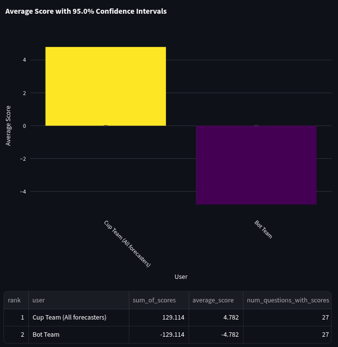 The cup team (i.e. community prediction) beat the bots with a spot peer score of 4.8. However, the sample size is small, and we cannot calculate error bars using a t distribution since the distribution of scores fails a Shapiro normality test. This is evidence that the Community Prediction continues to outperform bots. It’s probably safe to assume the error bars are large in this comparison, so this is only a weak indication.
