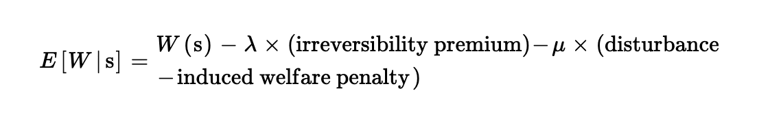 Where W is the expected welfare benefits given action s, λ is the risk of causing irreversible ecological changes, and μ is a more general measure of the risk of ecological disturbance. Quantifying the irreversibility premium and the disturbance-induced welfare penalty is beyond the scope of this article, and is an important area for future research. Nonetheless, the equation makes clear that we should favor interventions where the degree of ecological risk is low relative to the welfare benefits, especially where there is a risk of irreversible changes.
