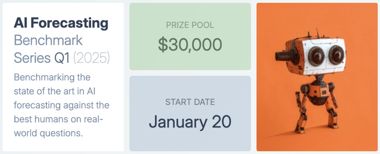 Our AI Forecasting Benchmark launched in Q3 2024 to systematically compare AI forecasting capabilities against top human predictors. Q1 2025 recently launched with a $30,000 prize pool and a more rigorous framework that includes a wider variety of question types.