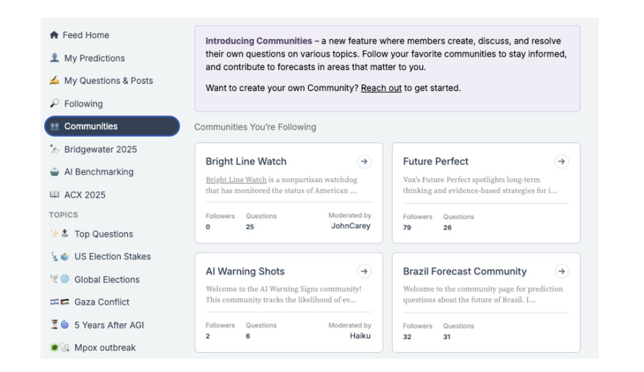 While most of our Communities are Unlisted, creating spaces for groups like ivy-league forecasting teams, college forecasting courses, niche Substacks, and policy-focused podcasts, some are publicly available in the sidebar, including: