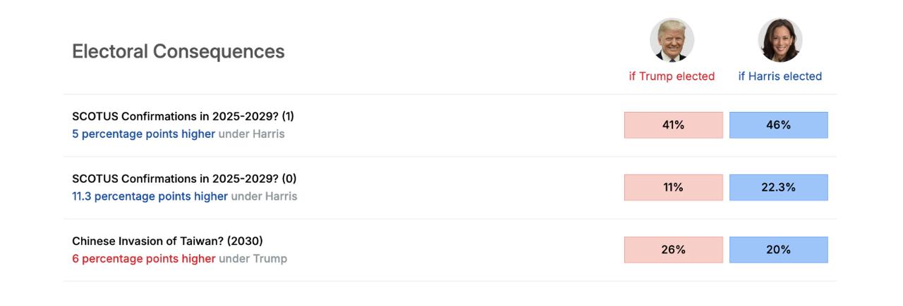 Our election coverage centered on two key projects. The Election Hub provided an interactive map for tracking the presidential race with state-by-state predictions and electoral vote counts updated as forecasts evolved. We also launched the Election Consequences project to look beyond vote counts and explore concrete outcomes under different scenarios, like dramatically different probabilities for Russian territorial gains in Ukraine depending on which candidate won.