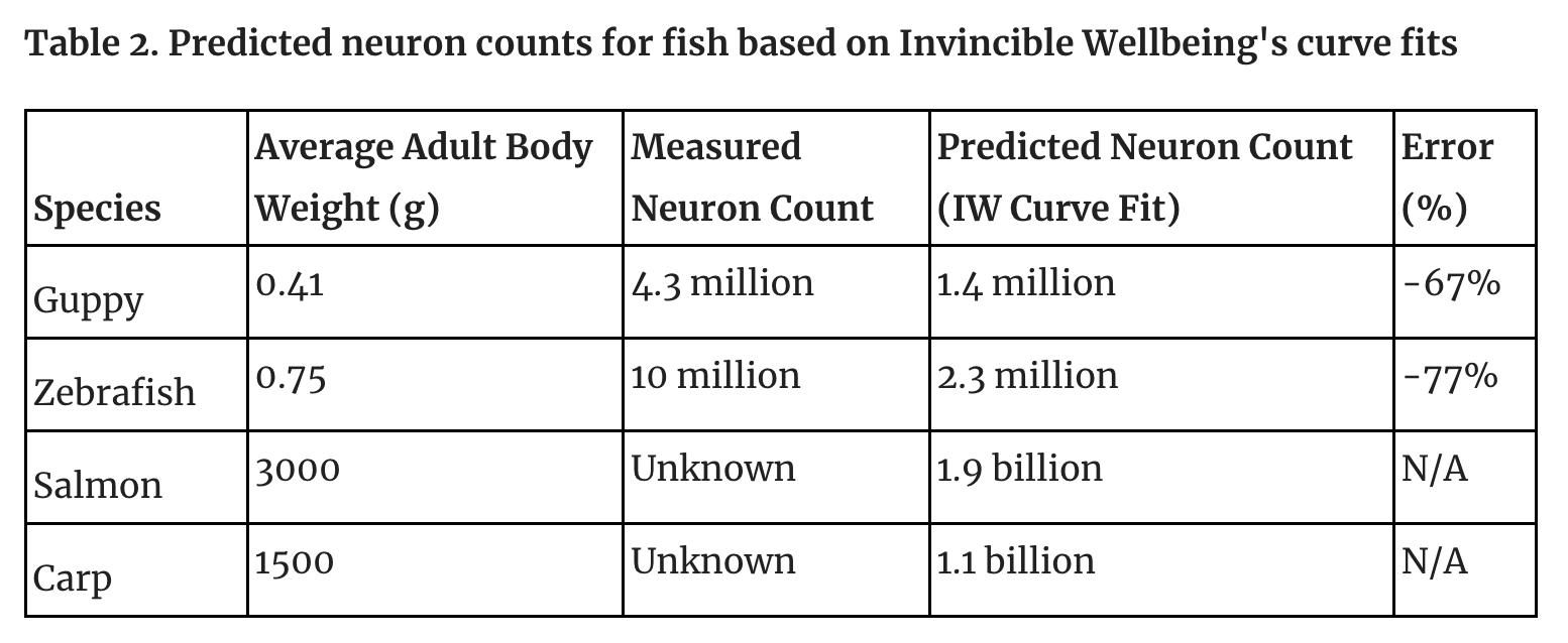 Following on previous posts on why neuron-counts aren’t a particularly useful proxy for moral importance of various animals, this post addresses how current neuron counts might underweight the experiences of farmed fish. The key point is that current estimates for neuron counts of farmed fish are from very small fish, under 1g in weight. Despite this, these neuron count estimates are applied to farmed fish, which are often 1000x more massive, without any correction for the differences in body weight.