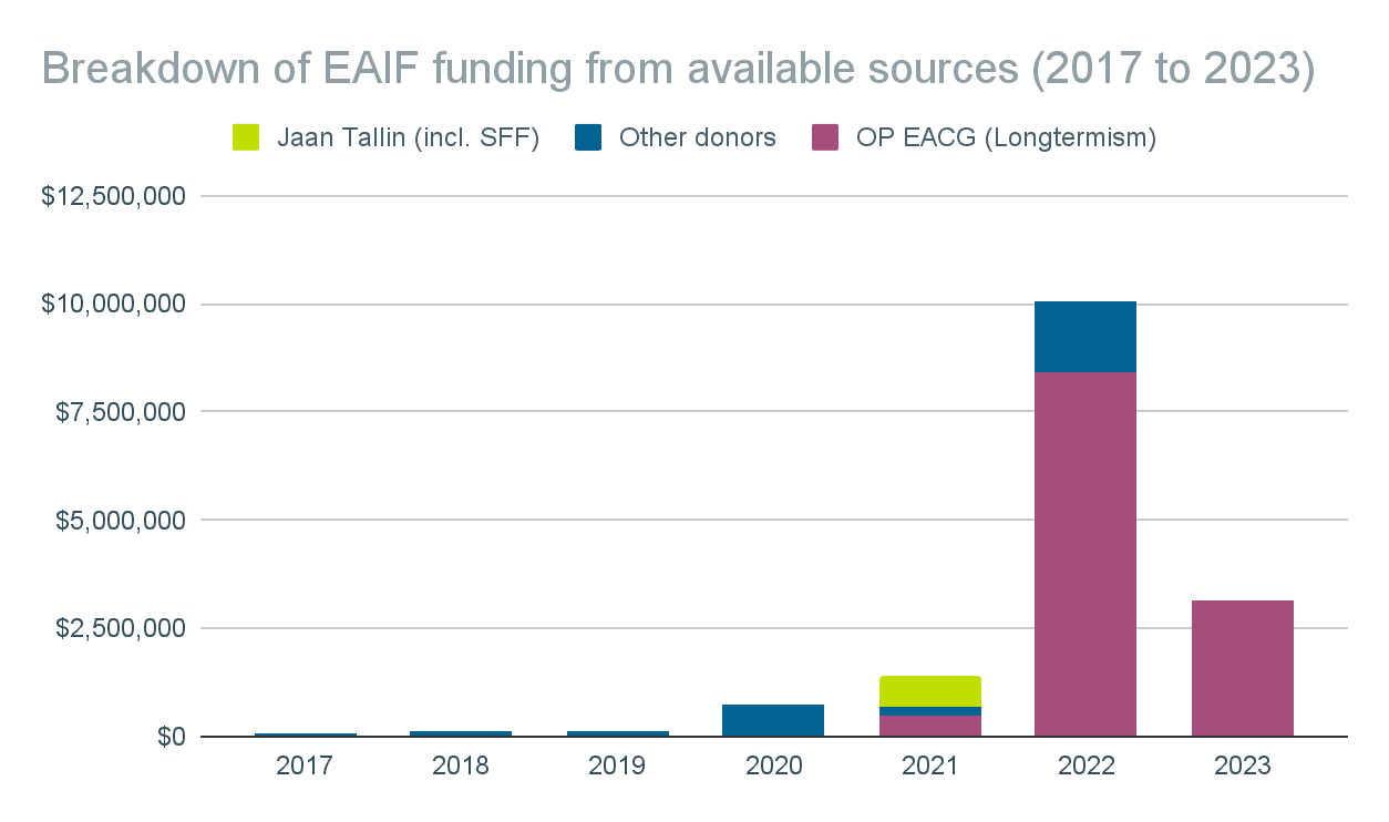 I’ve tracked about $12.4M from 2017-2022 in donations, while total grants EAIF disbursed during this period were $16.5M, so about $4M of donation data is missing. I expect that the difference of $4M will be made up in direct or individual donations which would bring the breakdown of funding to 41% individuals and 59% OP Longtermist.