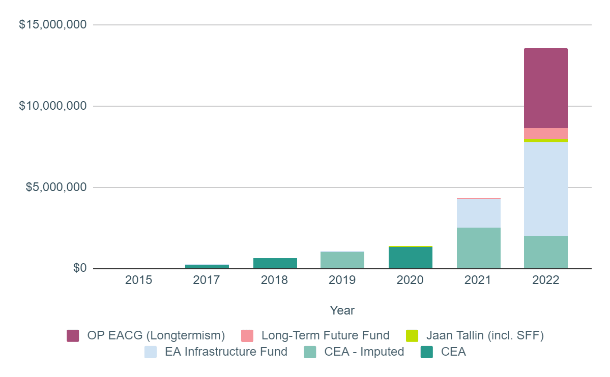 CEA also launched it’s Community Building Grants (CBG) program in 2018 with 1 full-time equivalent (FTE) staff in charge of the program. CEA noted that much historic groups support “provided by CEA, Rethink Charity [previously .impact], EAF [EA Foundation, German EA national group] and others has focused on either seeding local groups or providing a small amount of support to a large number of different groups.” The goal of the CBG was “making some of the most promising local groups even better.” In 2018, they disbursed $623K in funds (~10-15 FTE). There were limited sources of other community building funding at the time. CEA declined to provide the breakdown of funding that went to the CBG program for 2019, 2021 & 2022 so those numbers are imputed at $1M, 2.5M and 2M respectively) (see spreadsheet for rationale). In 2020 they reported spending $1.32M on the CB grants program.