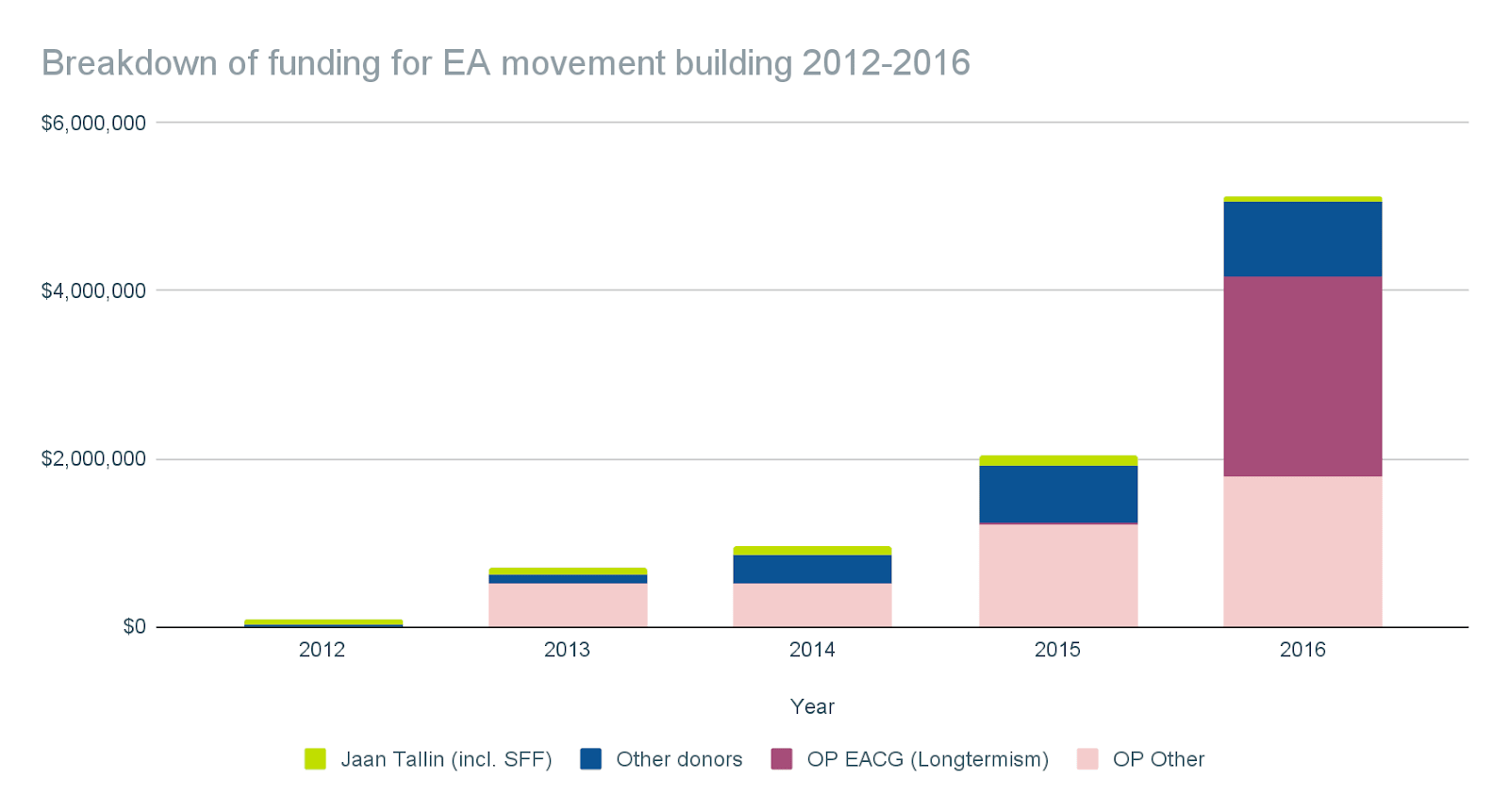 Before 2016, there was very limited funding available for meta projects and almost no support from institutional funders. Most organizations active during this period were funded by individual earning-to-givers and major donors or volunteer-run, not all of which is captured in the numbers. Here’s a view of funding from 2012-2016: