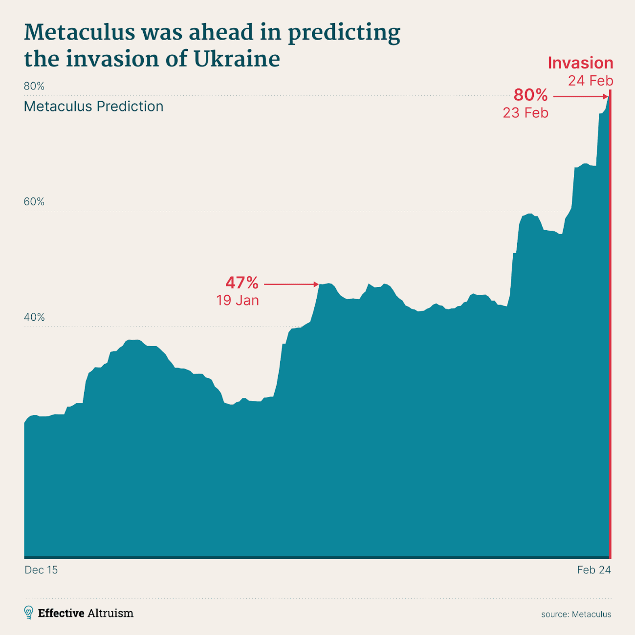 Muitos problemas globais são exacerbados por falta de informações confiáveis. A Metaculus é uma organização sem fins lucrativos que identifica assuntos importantes, tais como a possibilidade de a Rússia invadir a Ucrânia, faz estimativas baseadas em centenas de previsões e as pesa conforme sua previsão anterior. Em meados de janeiro de 2022, a Metaculus apontou que havia uma probabilidade de 47% da Rússia invadir a Ucrânia, que passou para 80% pouco antes da invasão no dia 24 de fevereiro[21]– época em que muitos eruditos, jornalistas e especialistas diziam que isso não ocorreria de forma alguma.