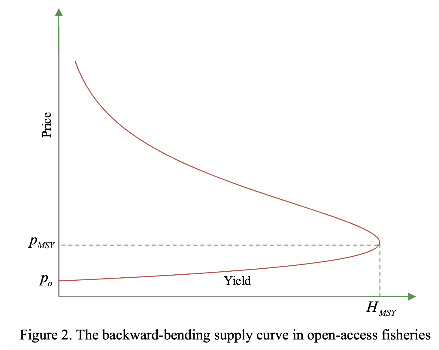 - In open access (wild) fisheries — i.e. (wild) fisheries without policies restricting total catch and without responsive management, e.g. seasonal closures — supply increases as fishing pressure (or harvest rates)[3] or prices increase when they are less than those that achieve the maximum sustainable yield, barely responds near the maximum sustainable yield, and decreases when fishing pressure and prices are less than those that achieve the maximum sustainable yield, as illustrated in the two graphs above (Eide, 2012, Eide, 2011, Copes, 1970, Pham & Flaaten, 2013 (pdf), Ritchie & Roser, 2021–2024, Maximum sustainable yield - Wikipedia, Melnychuk et al., 2020, pp.9–16, Haddon, 2023, chapter 3). Inverse responsiveness, i.e. supply changing in the opposite direction as fishing pressure or prices, results from overfishing.
