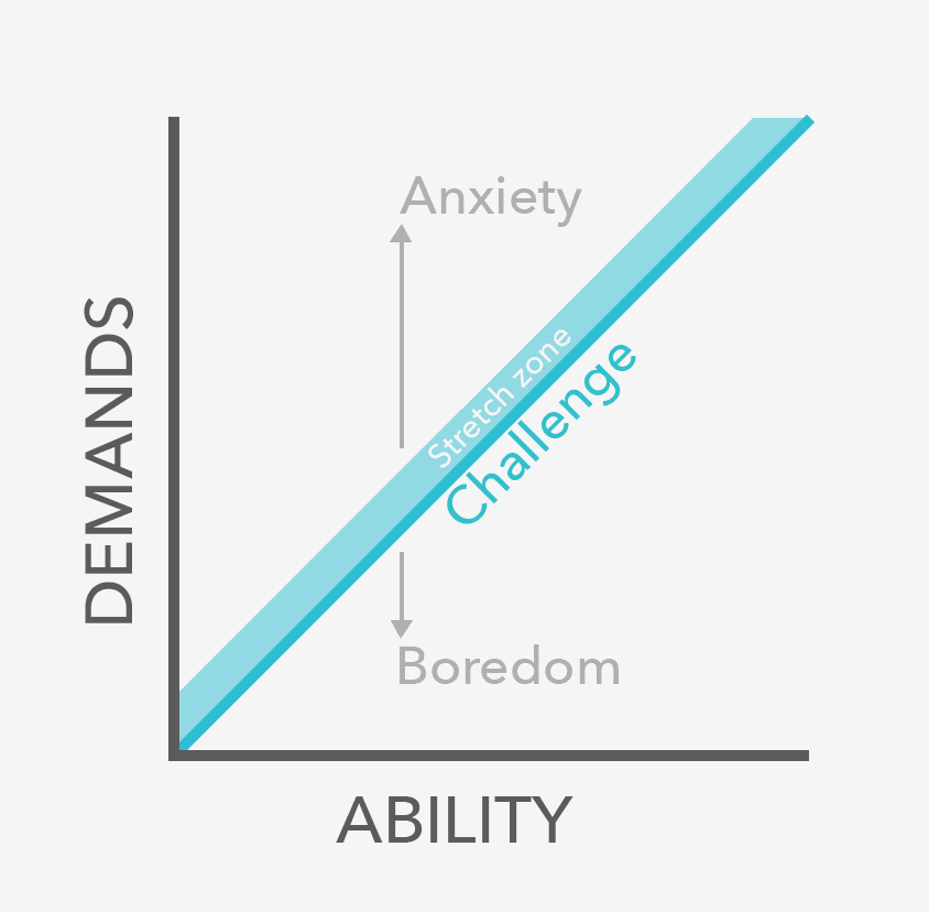 つまり状況は次の図のようになる。とりわけ要求の低い仕事は悪い、つまり退屈だ。自分の能力を超えた仕事も悪い:余計なストレスになる。ちょうどいいのは自分の能力に合った要求が課される場合だ。これはやりがいのあるチャレンジとなる。