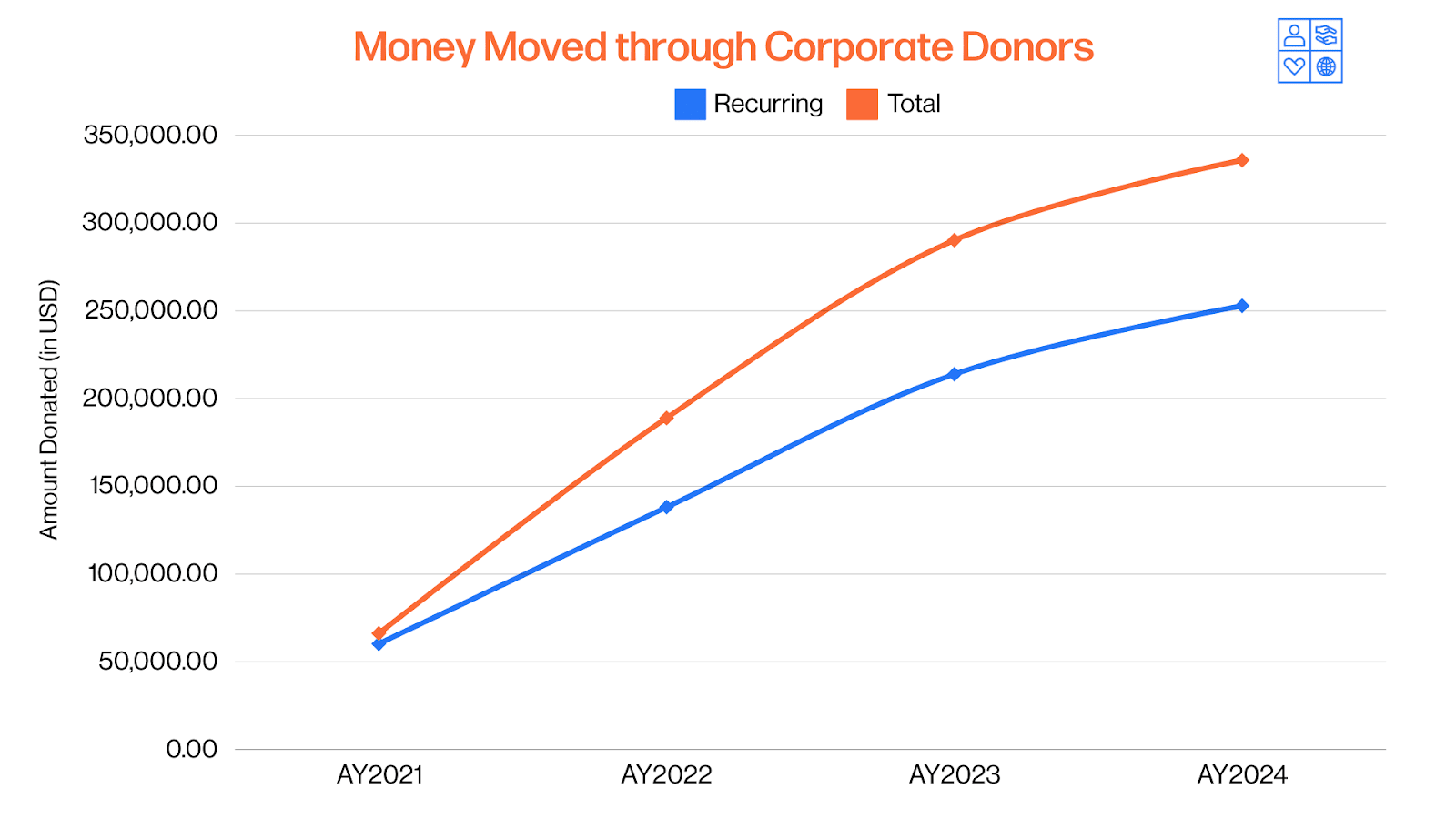 One for the World started as a grassroots organization built by student volunteers in 2014 at the Wharton School of Business. Since then, we have grown to a high point of $1.85m moved annually in AY23, supported by our base of university chapters across the US, Canada, UK, and Australia, and corporate outreach. This was followed by a bounce down to $1.55m moved in AY24. However, we have a growing source of money moved in our focus on company outreach.