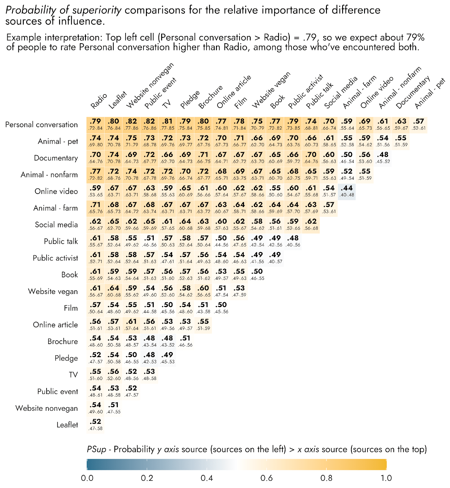 I worry that the data collected (about influence methods) just recapitulates a public-to-private gradient, which itself could predict the low-to-high relevance and affiliation survey results, while the paper does not account for this expectation. That is: we already know people don't like radio ads and do like having conversations with their friends. In a survey, I would expect that people think radio is not relevant to their thinking. However, broadcasting vegan-promoting ads will cause more conversations, encourage a little more research, and normalize the choice. The post acknowledges similar considerations, but I want to encourage these considerations to have more effect on the analysis chosen.