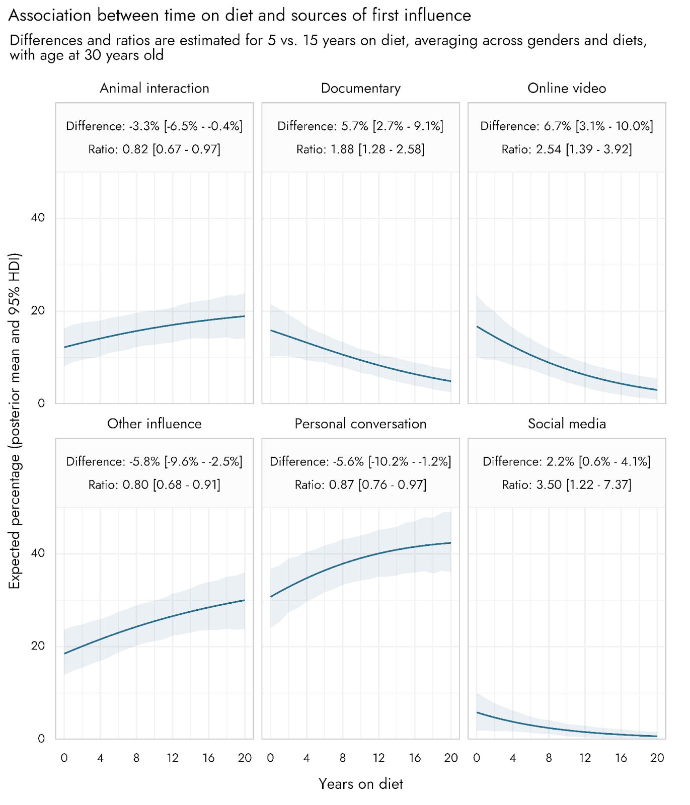 Time on a vegan/vegetarian diet was associated with the likelihood of selecting every separate outcome. Comparing the estimates of those on their diet for 5 vs. 15 years, more recent adopters were 3.5 times more likely to select Social media, 2.5 times more likely to select Online videos, and 1.9 times more likely to select Documentary. Conversely, those adopting their diet 15 years ago were 1.2 times more likely to select Animal interaction, 1.1 times more likely to select Personal conversation, and 1.3 times more likely to select Other. Hence, it would appear that with increasingly recent adoption of vegetarian or vegan diets, different sources of influence are rising to prominence: Documentaries and a range of online sources such as videos and social media are taking up an increasing share of ‘first influence’ space in more recent years.