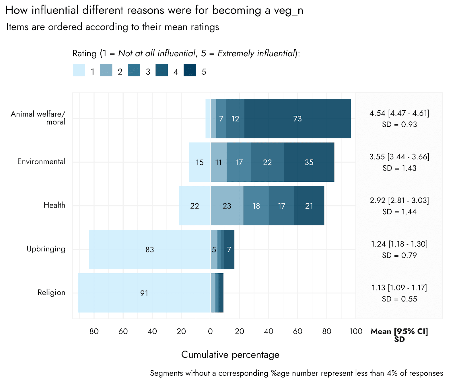 Only a minority of respondents indicated that either their upbringing or religious beliefs were at all influential for them in taking up a vegetarian or vegan diet, although 7% still indicated that their upbringing was an extremely strong influence. Still, by far the most endorsed reasons were animal welfare concerns, which 73% indicated were extremely important for them. Though not as highly endorsed as animal welfare reasons, both environmental and health reasons were much more endorsed that upbringing or religious beliefs, which had at least some influence for most respondents.