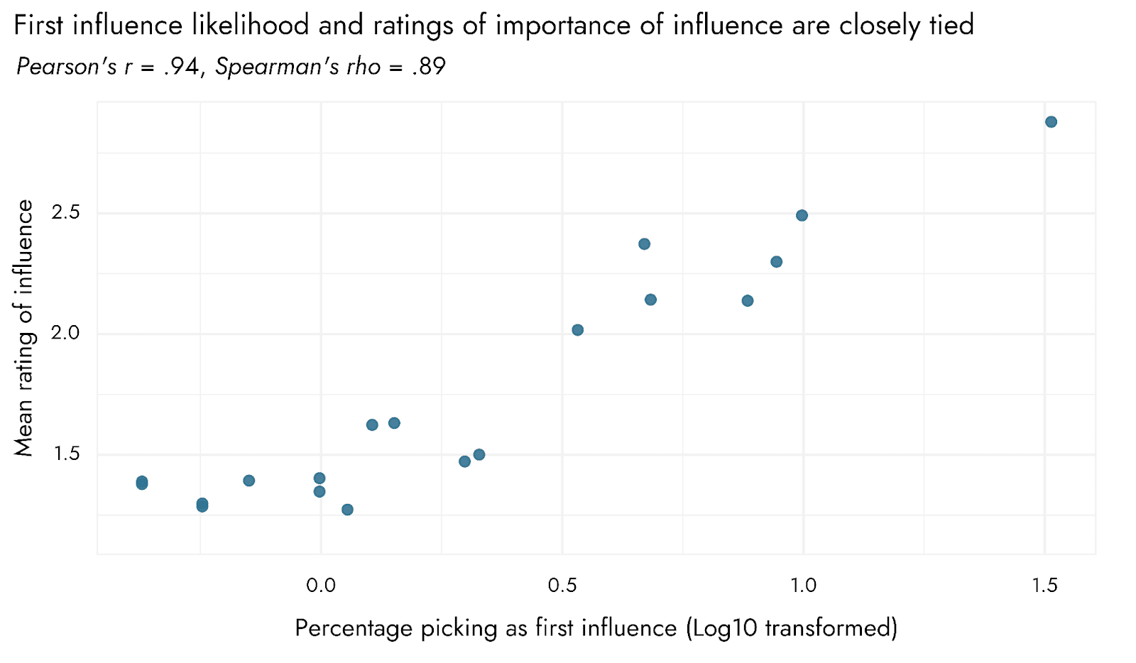 On seeing this tweeted, and noticing the alignment of "rating 1" percentages, I think I should more correctly understand your emphasis as: ranking of factors to minimize the fraction of people reporting "no influence" for the factor.