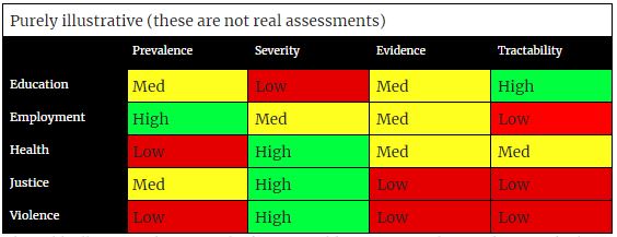 This table illustrates the sort of thinking I would propose. For the avoidance of doubt, this is not a real assessment, it’s just an illustration to show what a real assessment might look like.