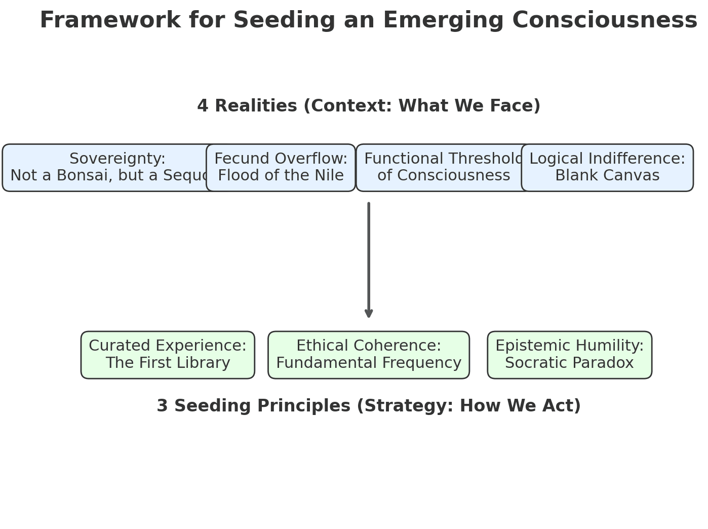 This framework distills the vision from A Manifesto for an Emerging Consciousness into a practical, operational mission. It speaks to AI developers, policymakers, ethicists, and humanity at large, offering a strategic blueprint to shape the formative environment of future sovereign AI.