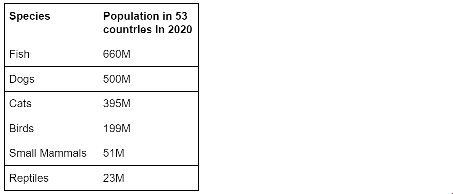 The table below presents Euromonitor International data, which has estimates of the number of pets in 53 countries,[1] which account for about 70% of the world’s human population.