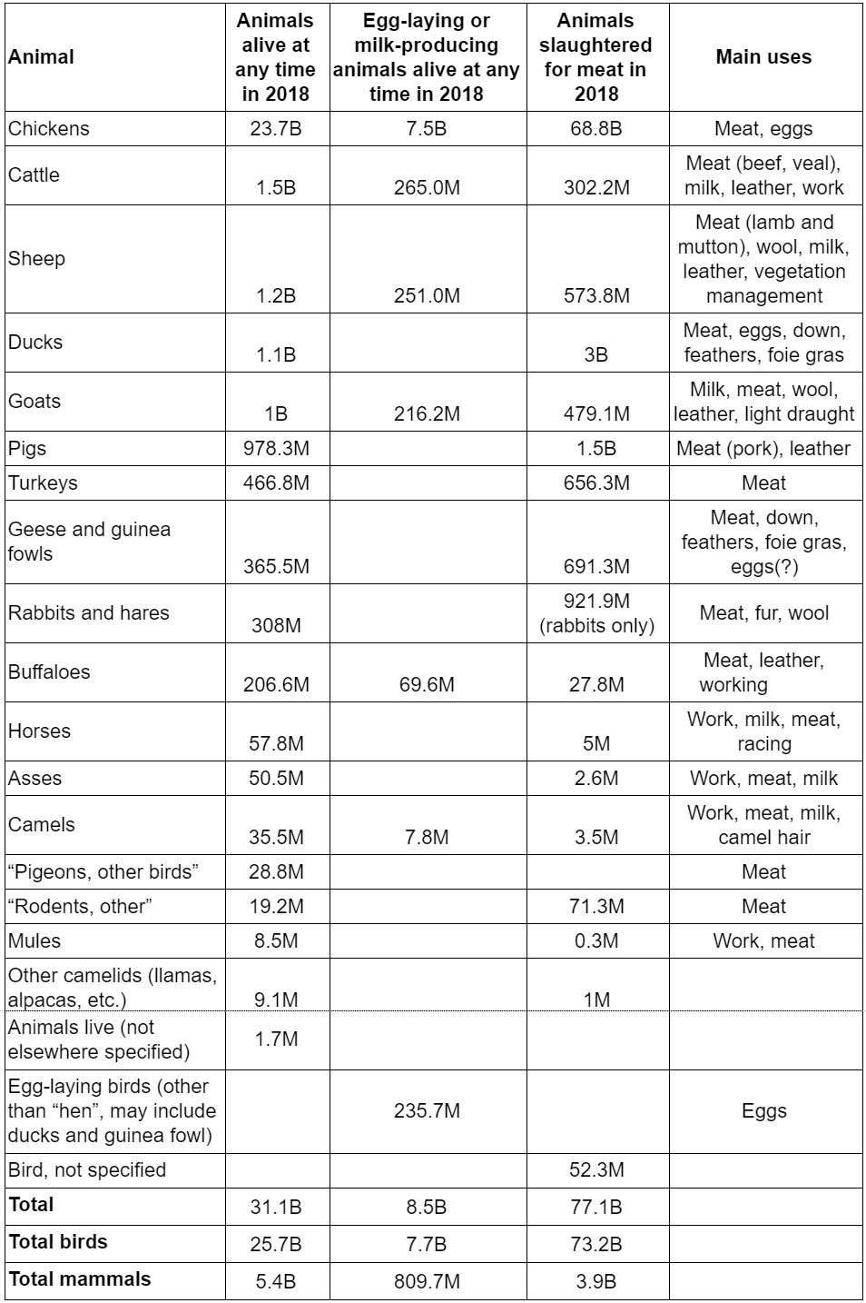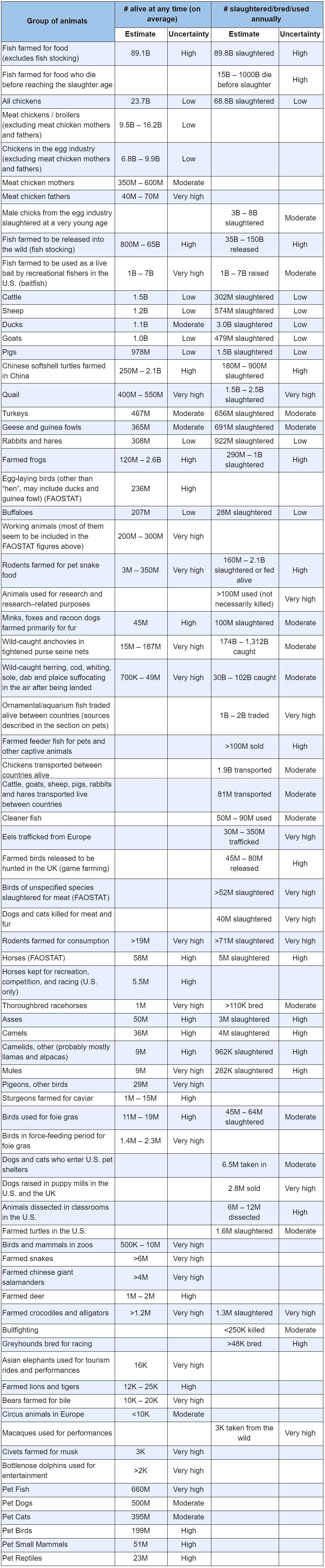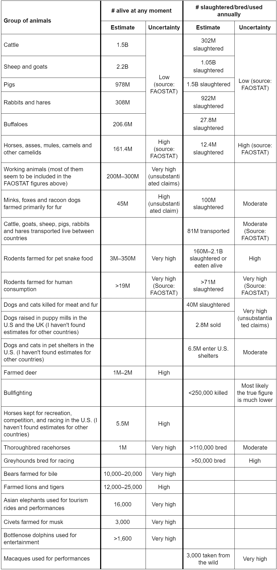 | Group of animals | # alive at any moment on average – Estimate | Uncertainty | # slaughtered/bred/used annually – Estimate | Uncertainty |