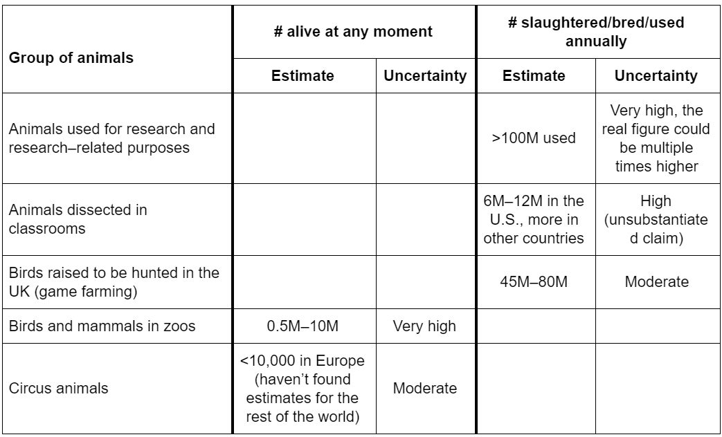 The purpose of the article is to make it easier to find and compare estimates. Hopefully, this can also help animal advocates decide which issues to focus on. Note that I chose to focus on captive vertebrates simply to limit the scope of the article.