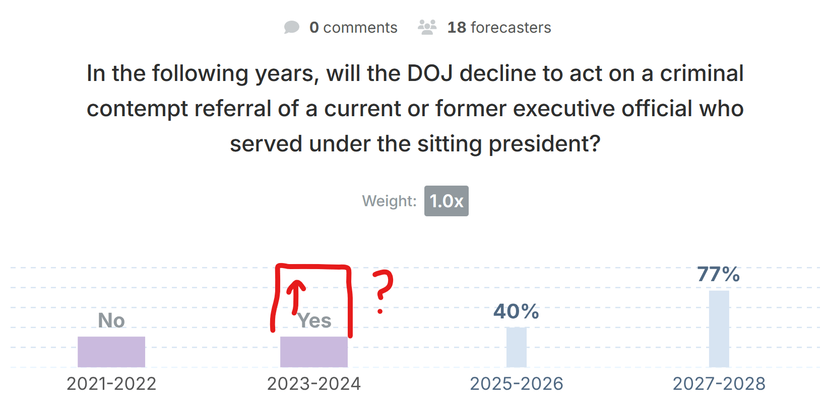 That case, along with related questions about contempt referrals, DOJ follow-through, and the treatment of people sent to prisons abroad, are among the scenarios covered in Metaculus's U.S. Democracy Threat Index, a forecasting series we built with Bright Line Watch, a nonpartisan watchdog group. We just added a $10,000 prize pool to incentivize accurate forecasts.