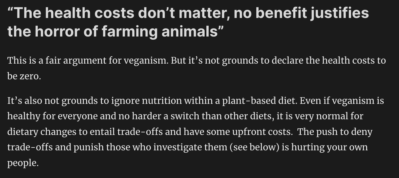 I have a lot of respect for Soto for doing the math and so clearly stating his position that “the damage to people who implement veganism badly is less important to me than the damage to animals caused by eating them”. Most people flinch away from explicit trade-offs like that, and I appreciate that he did them and own the conclusion. But I can’t trust his math because he’s cut himself off from half the information necessary to do the calculations. How can he estimate the number of vegans harmed or lost due to nutritional issues if he doesn’t let people talk about them in public?