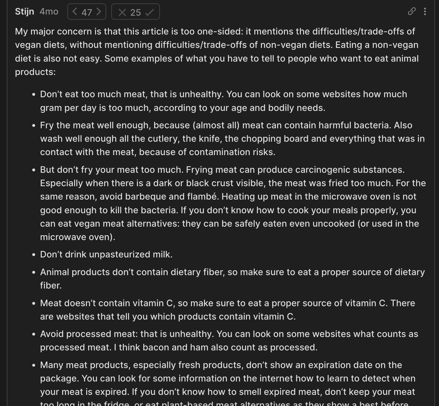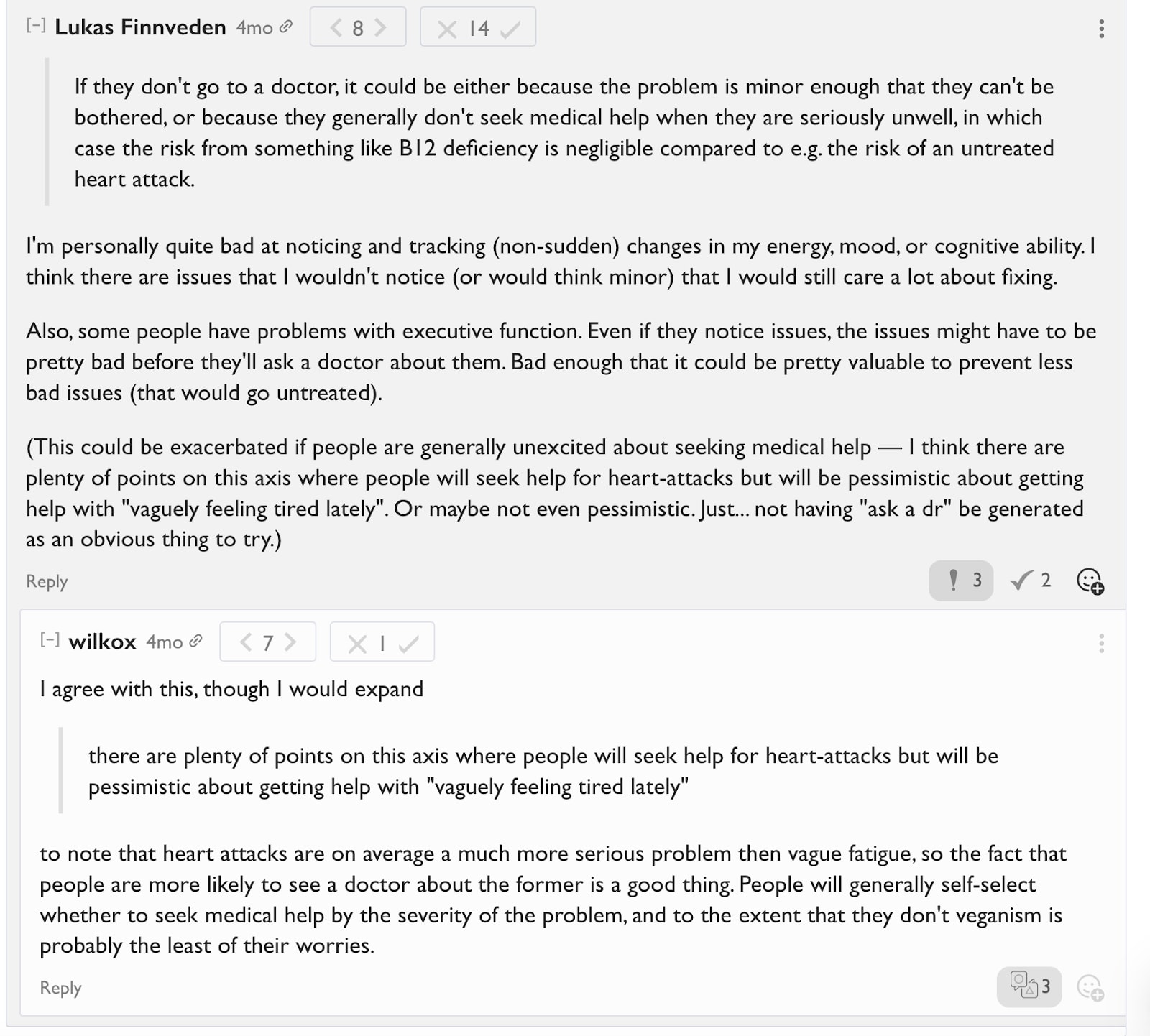 For example, I’ve already quoted Wilkox’s very fuzzy comment (reminder: this was the top voted comment on that post on LW). That was followed by a 13+ comment exchange in which we eventually found he had little disagreement with any of my claims about vegan nutrition, only the importance of these facts. There really isn’t a way for me to screenshot this: the length and lack of specifics is the point.