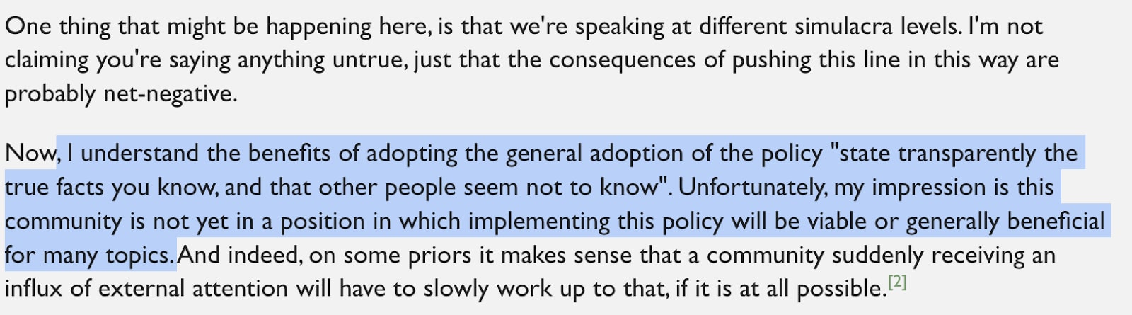 The tone is kind of obnoxious and he’s arguing with something I never claimed, but his beliefs are quite clear. I can immediately understand which beliefs of his I agree with (“vegans moving to naive omnivorism will hurt themselves” and “that would be bad”) and make good guesses at implicit claims I disagree with (“and therefore we should let people hurt themselves with naive veganism”? “I [Elizabeth] wouldn’t treat naive mass conversion to omnivorism seriously as a problem”?). That’s enough to count as epistemically cooperative.