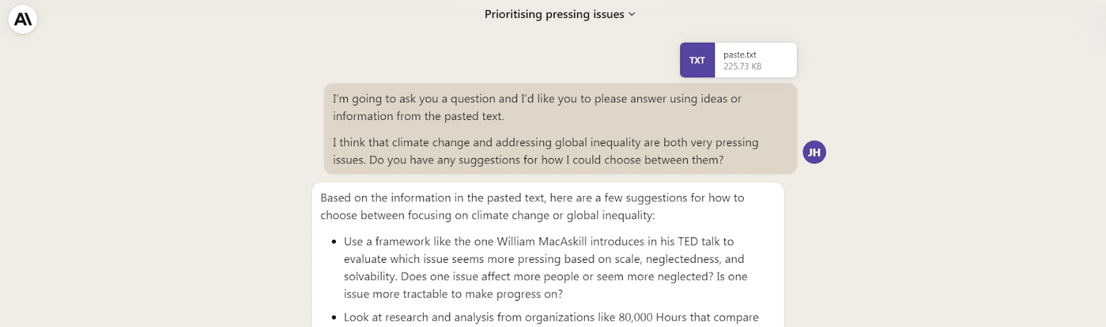 Claude (when loaded with week 1 of the EA Handbook / intro fellowship): “I understand the concern about comparing very different causes. There are some good counterpoints to consider: