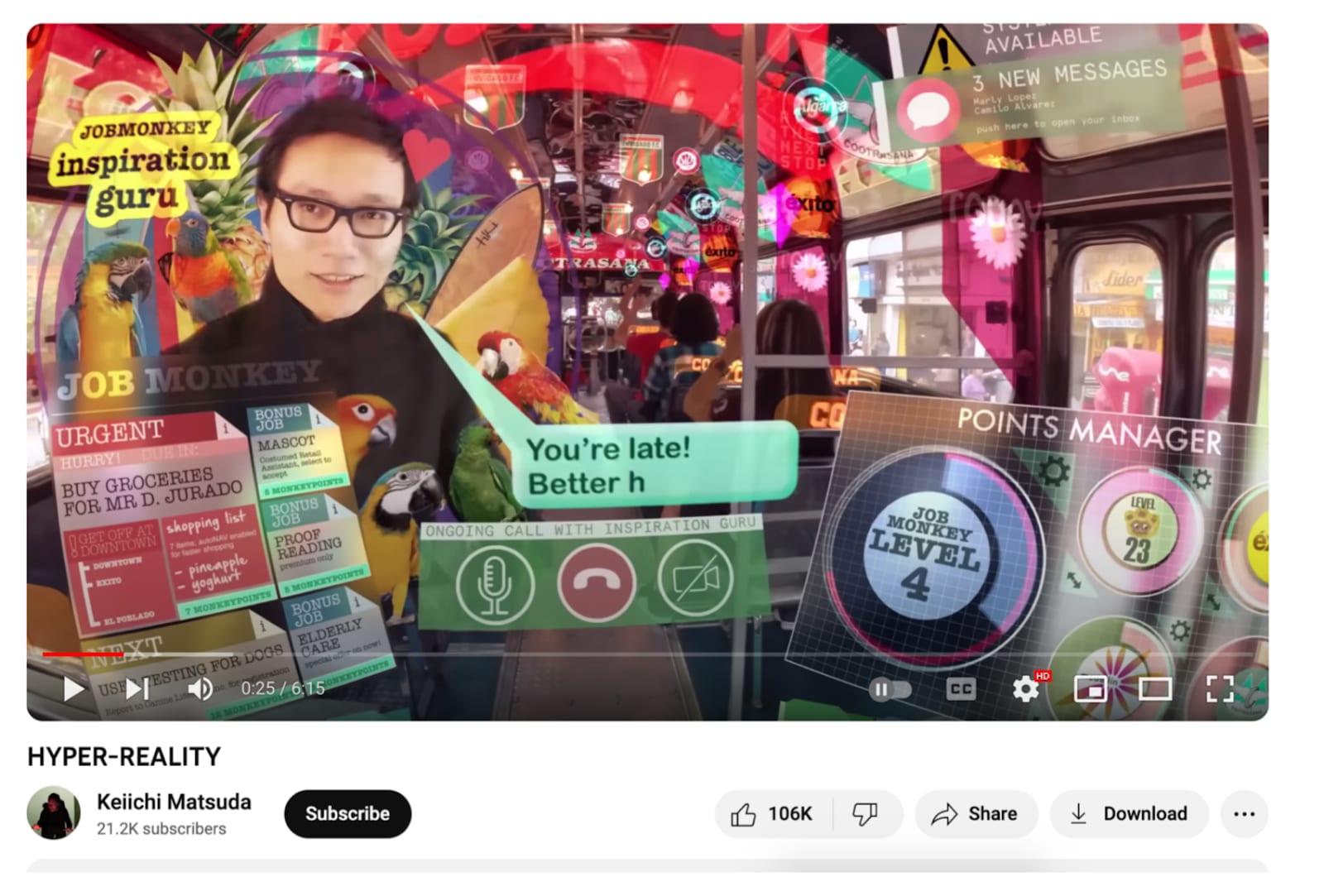To the contrary, the mockumentary HYPER-REALITY by Keiichi Matsuda shows us a fake, sick, weak, fearful, strained, inhibited, noisy technological environment. An environment which is, ultimately, destroyer of life.