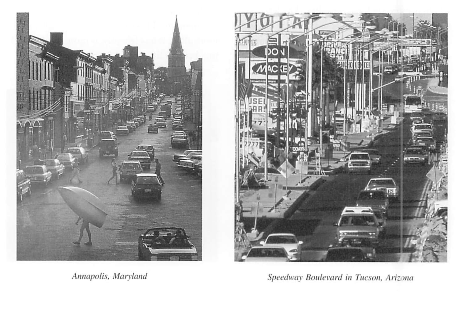 Two congested streets, both in downtown areas of cities, Tucson and Annapolis. Still, one of them (Annapolis) has detectably more life than the other. The large poles in Tucson are intrusive and thus create a sense of suppression that blocks the fluidity that is life.