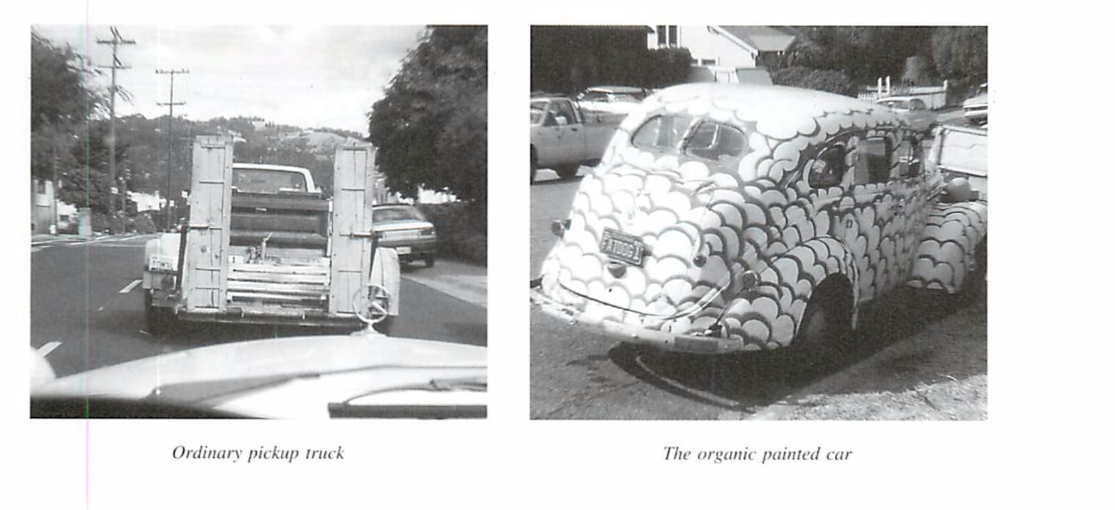 The funky and organic image is not always the one with more life. Here the painted car from California seems to symbolize life, and might therefore be chosen as more alive by an unwary reader. but if you ask yourself which of the two actually has more life, makes you feel more in touch with life in yourself, has more of the truth of everyday events in it. you may then find that the pickup truck, ordinary though it is, is more genuinely in touch with life, more connected. The organic car is more an image than it is genuinely connected to life. The pickup truck looks less inspired, but it is more truly alive.—Christopher Alexander