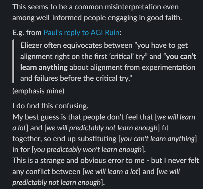 This tells us things about the kind of challenge researchers are facing, not just about the magnitude of the challenge. There’s a deep challenge, and a ready availability of shallow patches which will look convincing but will fail under pressure. Researchers can use their ingenuity to try to find a solution, but brushing this feature of the problem off with “there are differences between ML and evolution” (without acknowledging all the convincing-looking shallow patches) makes me worry that this aspect of the problem hasn’t really been appreciated.