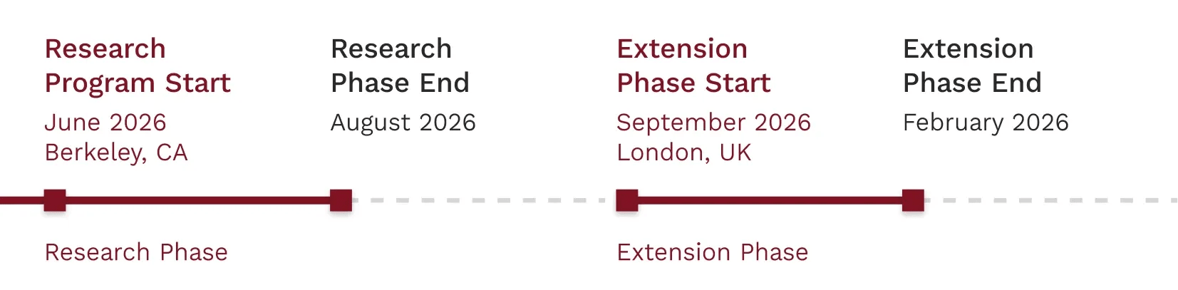 The initial program runs for 12 weeks (June–August 2026) in Berkeley, London, or remotely, depending on stream. Fellows receive:
