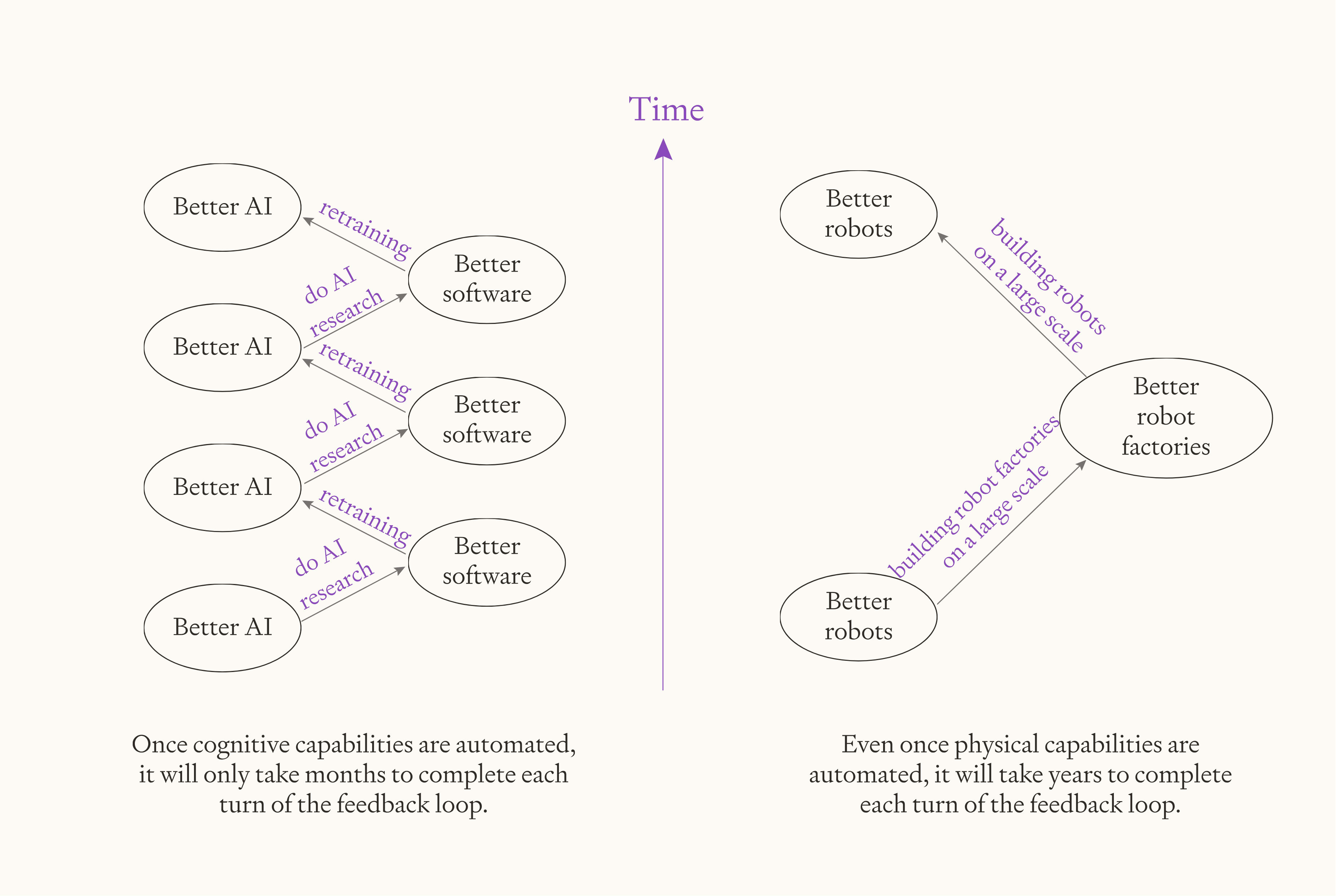 The second reason the industrial explosion will be slower is because the feedback loop of “robots make more robots” is has a bigger time lag than the feedback loop for “AI makes smarter AI”: