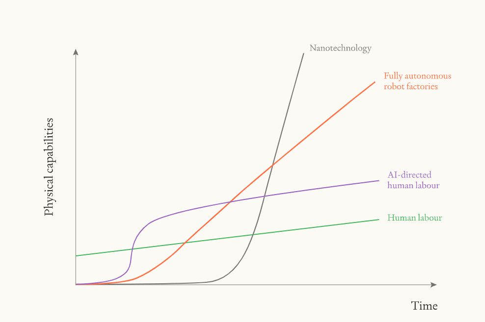 - AI-directed human labour, where AI-directed human labourers drive productivity gains in physical capabilities.