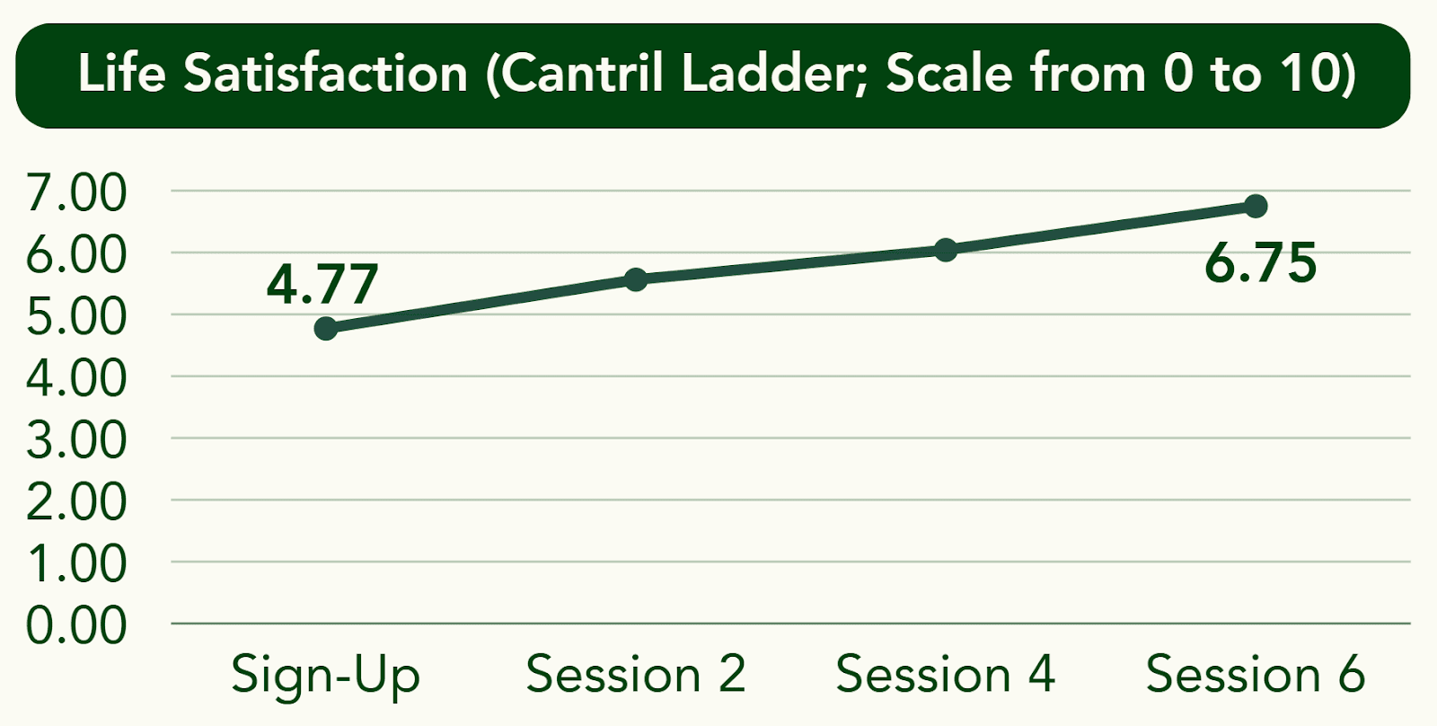 On average, people are 2 points out of 10 happier after their first six sessions. Each session costs just $5 to deliver (ALL costs inclusive - marketing, training of coach, supervision, management, etc).