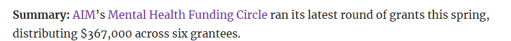 EA Global health funders don't rate mental health and neither do meta funders. The one funder we align well with is the Mental Health Funding Circle: