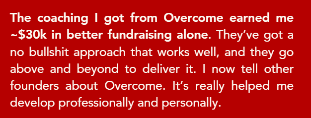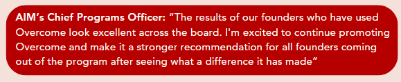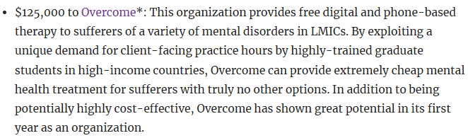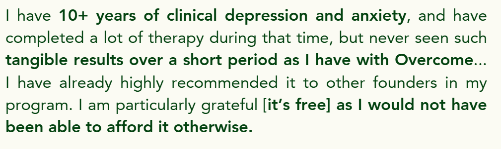 Executive summary: Overcome is a volunteer-driven mental health intervention that provides cost-effective therapy, primarily for founders and professionals, with extremely low per-client treatment costs and promising results.