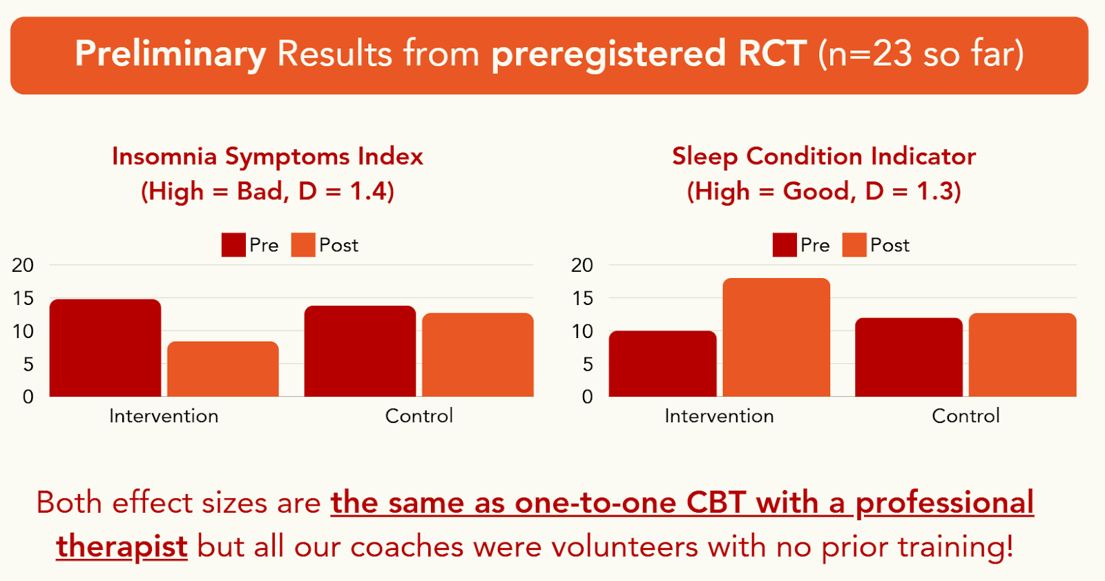 Here are the preliminary results of an RCT we're doing to treat insomnia. I'm showing this to demonstrate our results against a control group. This RCT only cost us $32k (all costs inclusive) to run because almost all the relevant staff were volunteers.