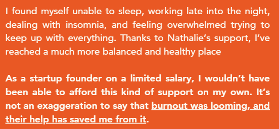 I’m one of the founders on those stats and Overcome has been essential to my mental health this year. We had a lot of changes this year and I had to learn a lot, which was tough at times. As a result of my sessions with Overcome I’m thriving even though I’m increasingly doing much more challenging work, my charity is doing very well and I do think a lot can be attributed to Overcome’s support. I think their services should be accessible to the whole EA and adjacent community. I was so happy with my sessions we promoted it to whole Hive community and over 100 farmed animal advocates signed up, which says something. Mental health is the foundation of impactful work! Thank you John and the team!!!