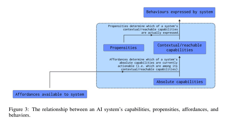 A figure from A Causal Framework for AI Regulation and Auditing provides more context about how the propensities of an AI system relate to its capabilities, affordances, and behaviors. We don’t describe the schema. Please refer to the original document if needed.
